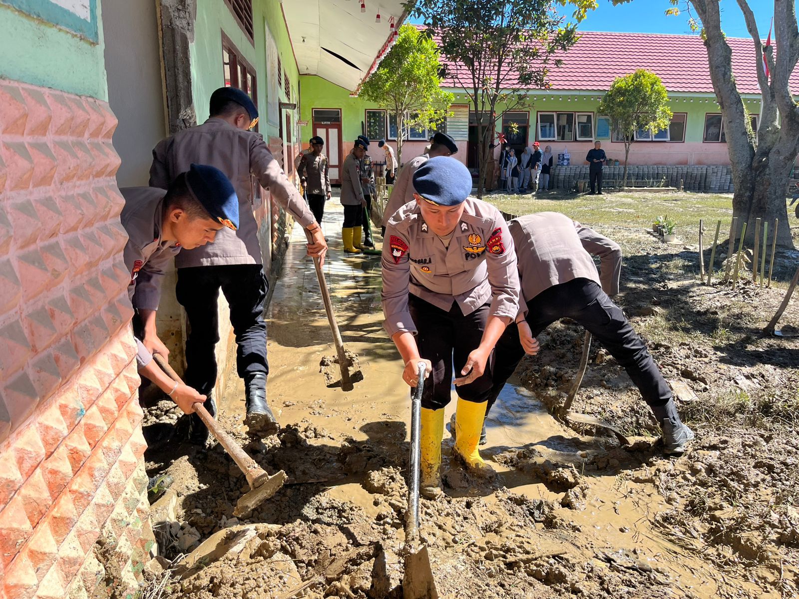 Dilanjutkan Dansat Brimob, selain membersihkan lingkungan sekolah hingga ruang kelas, kegiatan ini juga bertujuan untuk mempercepat pemulihan aktivitas belajar mengajar di sekolah yang sempat terganggu akibat banjir.