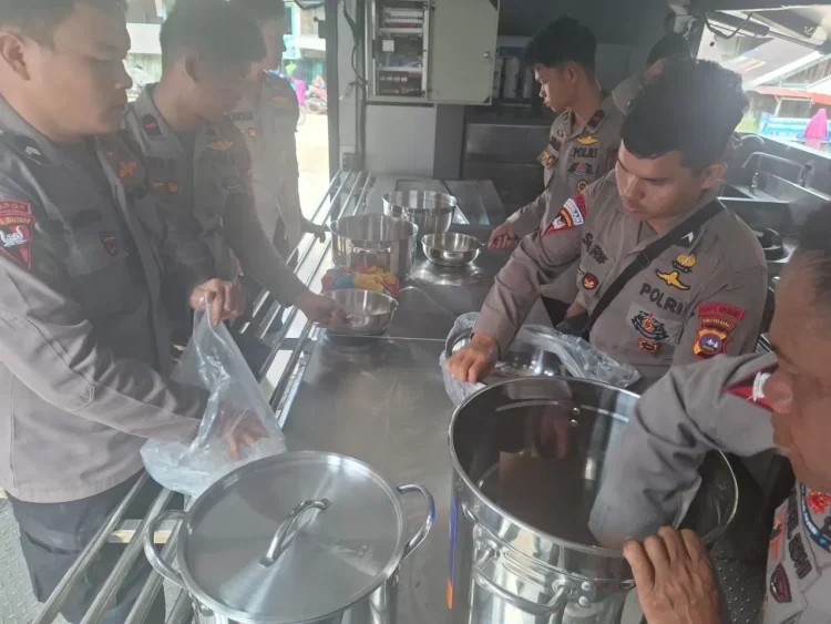 Dilanjutkan Dansat Brimob, anggota Brimob Polda Jambi yang dibantu Brimob Polda Sumbar dengan sigap memasak menggunakan peralatan dapur yang dipasang di mobil lapangan, memastikan makanan terdistribusi langsung ke lokasi-lokasi pengungsian.