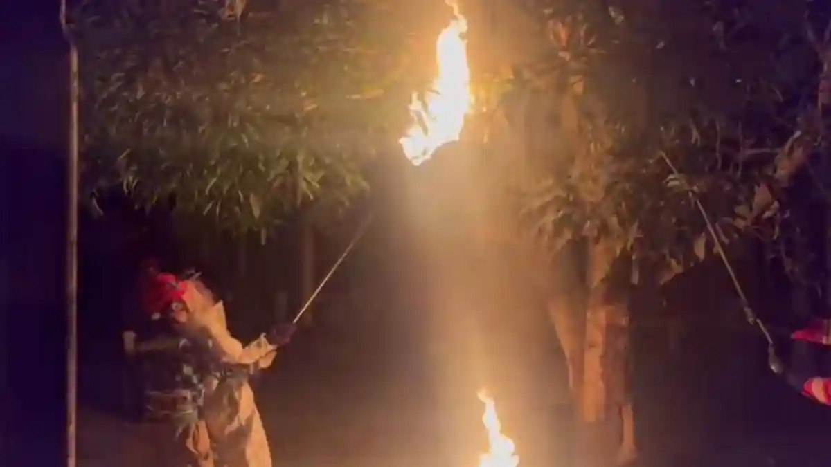 Petugas menggunakan metode pembakaran untuk mengusir tawon agar tidak membahayakan warga maupun siswa sekolah.