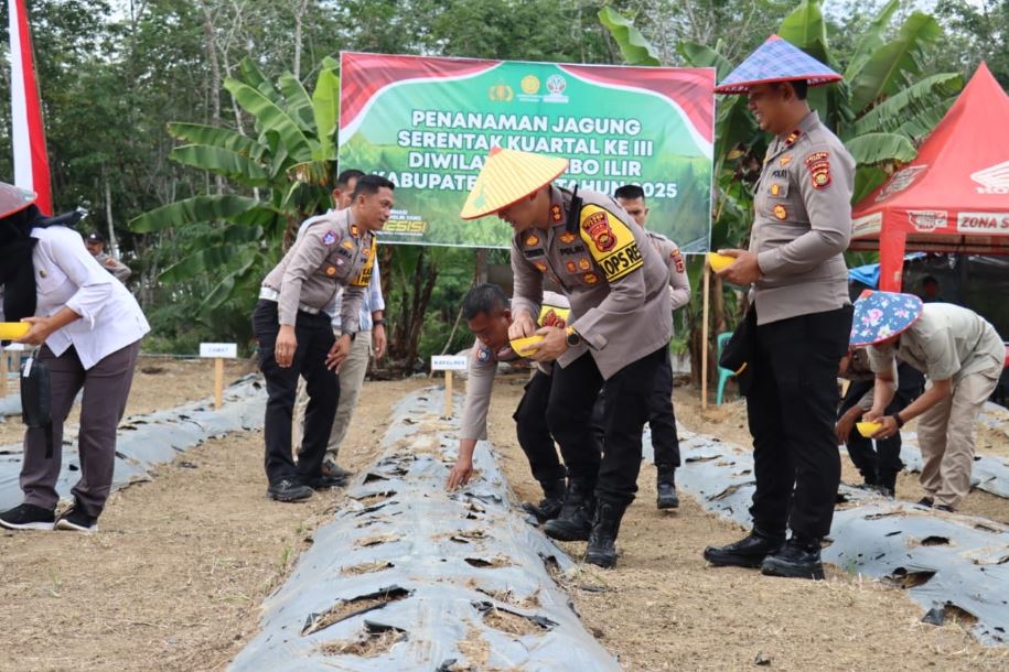 SEKATOJAMBI.COM, TEBO – Dalam rangka mendukung program nasional ketahanan pangan, Polres Tebo melaksanakan kegiatan Penanaman Jagung Serentak Kuartal Ke III yang dipusatkan di Desa Giri Mulyo, Kecamatan Rimbo Ilir, Kabupaten Tebo. Kegiatan ini dilaksanakan secara hybrid, yaitu tatap muka dan melalui Zoom Meeting bersama jajaran Polsek se-Kabupaten Tebo.