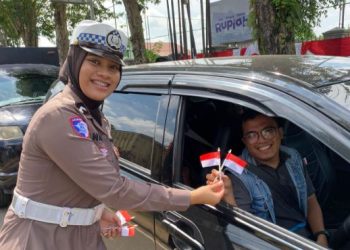 Satlantas Polresta Jambi Bagikan Bendera Merah Putih kepada Pengendara
