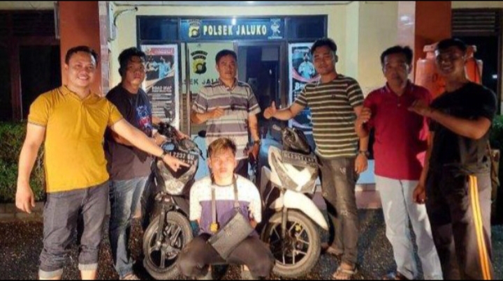 Unit Reskrim Polsek Jaluko langsung bergerak kerumah kontrakan Pelaku Di kelurahan Bagan Pete Kecamatan Alam Barajo dan Berhasil mengamankan pelaku di kontrakannya berserta 2 unit sepeda motor yang berada di kontrakan pelaku.