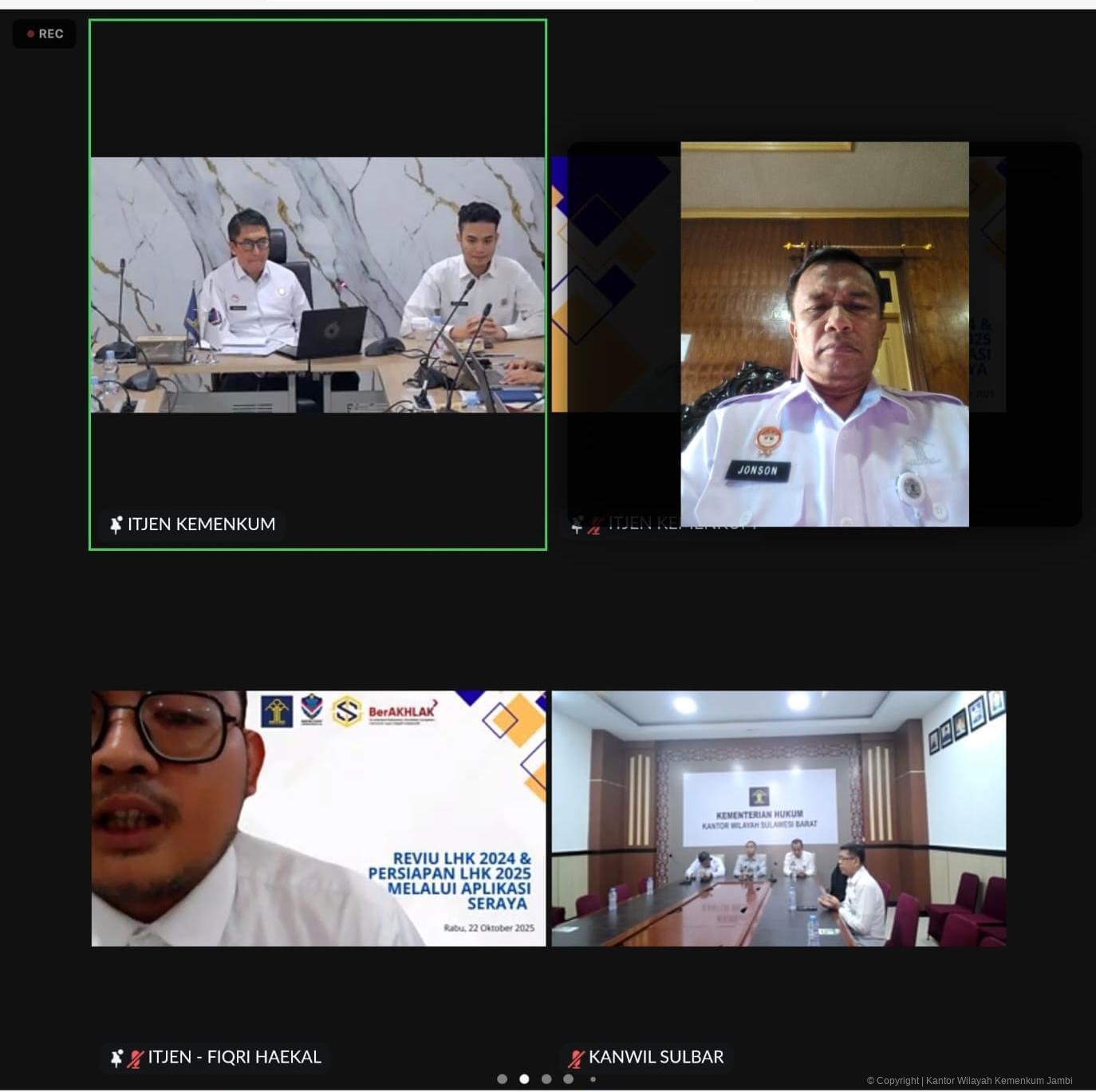 SEKATOJAMBI.COM, JAMBI – Kantor Wilayah Kementerian Hukum Jambi mengikuti kegiatan Reviu Kepatuhan Pelaporan Harta Kekayaan Aparatur Negara (LHKAN) Tahun 2024 sekaligus Persiapan Penyelenggaraan Pelaporan Harta Kekayaan Tahun 2025 melalui Aplikasi SERAYA (Sistem Informasi Pelaporan Harta Kekayaan Aparatur) yang diselenggarakan secara virtual melalui Zoom Mandiri, Rabu (22/10/2025).