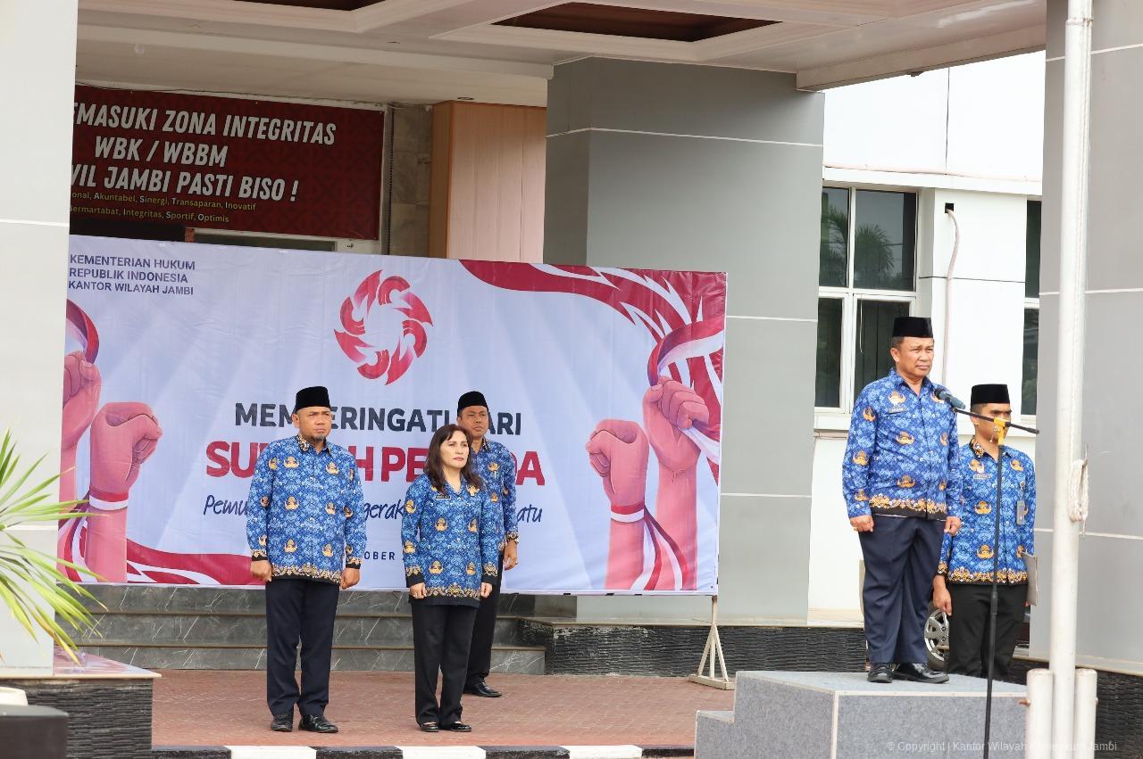 “Momentum Sumpah Pemuda harus menjadi pengingat bagi kita semua untuk terus menanamkan semangat persaudaraan dan nasionalisme di tengah perubahan zaman. Pegawai Kemenkum, khususnya generasi muda, harus mampu menjadi motor penggerak perubahan menuju pelayanan hukum yang semakin profesional dan humanis,” ujar Jonson dalam amanatnya.