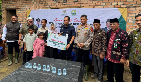 SEKATOJAMBI.COM, MUARO JAMBI – Kapolres Muaro Jambi, AKBP Heri Supriawan, S.I.K., M.H., mendampingi Bupati Muaro Jambi, Dr. Bambang Bayu Suseno, dalam penyerahan bantuan Program Bedah Rumah Baznas Kabupaten Muaro Jambi Tahun 2025 di Desa Sakean, Kecamatan Kumpeh Ulu, Kamis (04/12/25).