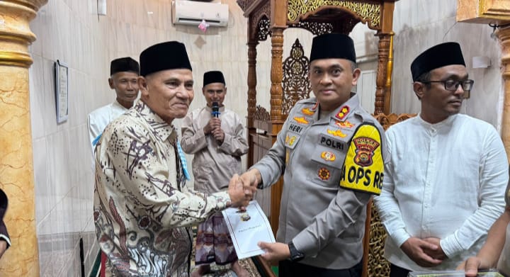 Menyerahkan Tali Asih kepada Imam Masjid oleh Kapolres Muaro Jambi dan Wakapolres Muaro Jambi. Ibadah Sholat Taraweh dengan jumlah 11 Rakaat. Pukul 20.45 Wib giat berakhir, situasi aman dan kondusif. (Sekatojambi.com/Noval)