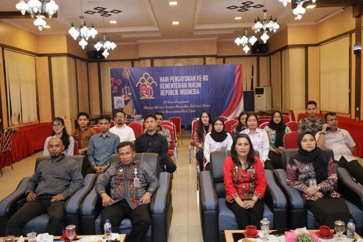 SEKATOJAMBI.COM, JAMBI – Kantor Wilayah Kementerian Hukum Jambi, Jonson Siagian bersama Pimti Pratama didampingi oleh Pejabat Manajerial dan Non Manajerial di Lingkungan Kanwil Kemenkum Jambi turut serta mengikuti kegiatan tasyakuran Hari Pengayoman ke-80 yang digelar secara virtual oleh Kementerian Hukum RI, Jumat (22/08/2025). Kegiatan yang dipusatkan di Graha Pengayoman Jakarta ini dihadiri langsung oleh Menteri Hukum dan HAM Dr. Supratman Andi Agtas, S.H., M.H., jajaran pimpinan tinggi madya, pratama, serta seluruh keluarga besar Kemenkum Republik Indonesia.