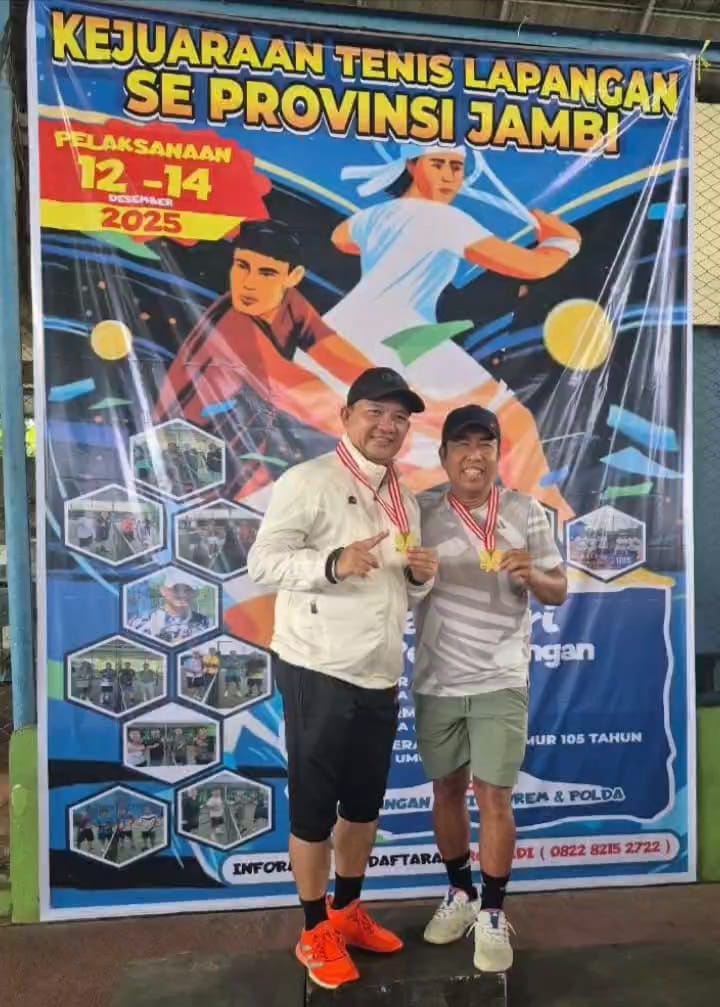 SEKATOJAMBI.COM, JAMBI – Pasangan ganda Kompol Dr. Novrizal dan Prima Surya meraih Juara I pada Turnamen Tenis Lapangan Terbuka se-Provinsi Jambi 2025 yang digelar pada 12–14 Desember 2025.