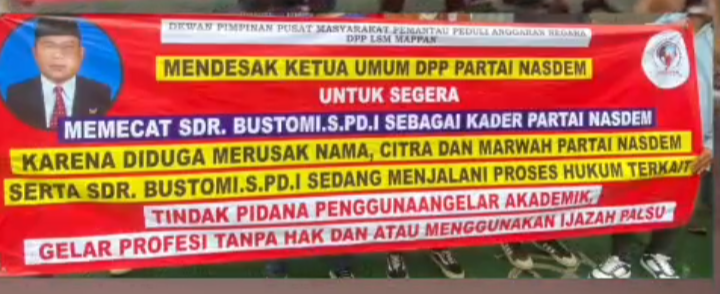 Dalam aksinya, DPP LSM MAPAN mendesak Ketua Umum DPP Partai NasDem untuk segera memecat Bustomi, S.Pd.I sebagai kader partai.