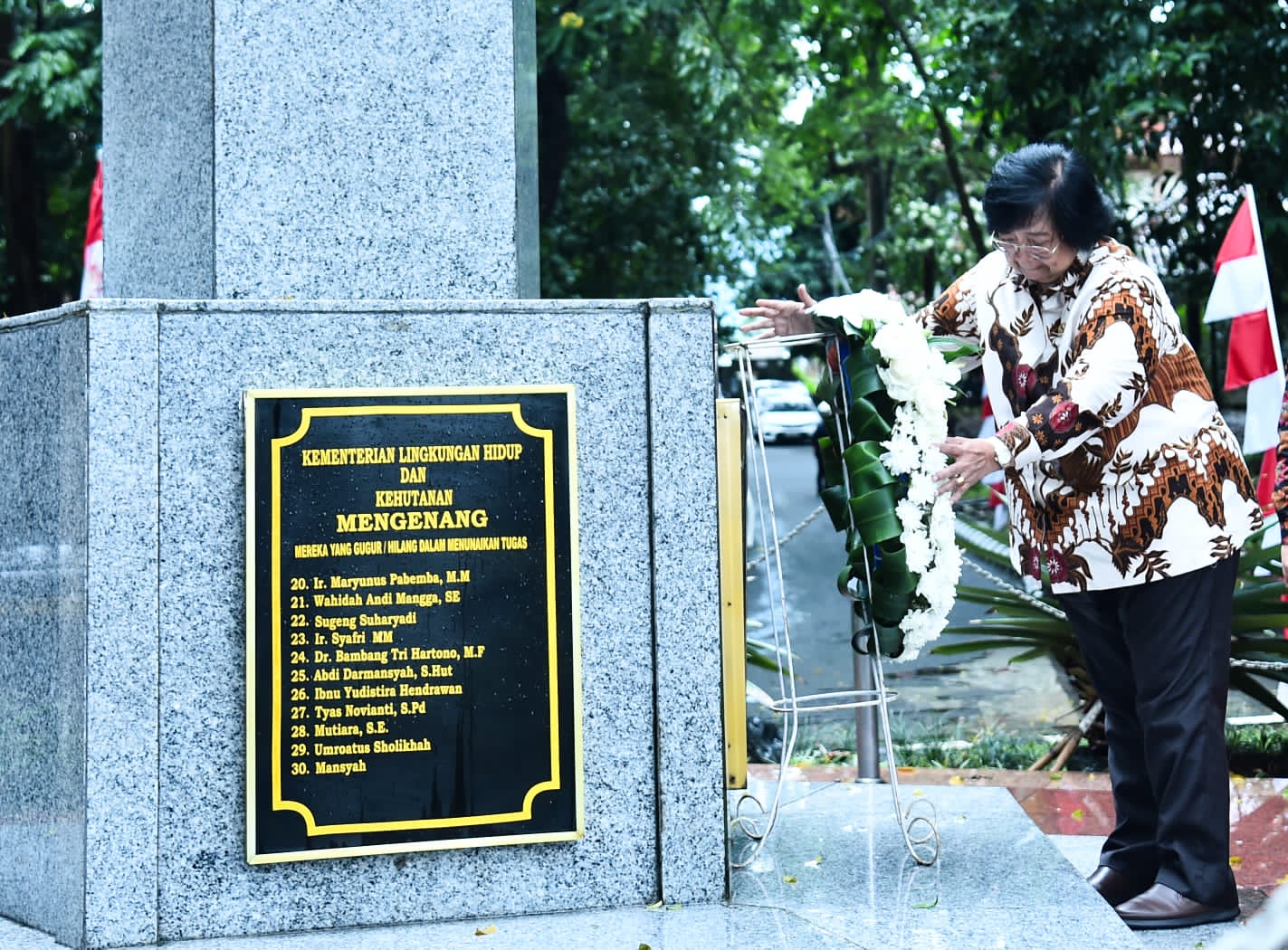 Melengkapi acara, Menteri Siti beserta jajarannya juga menyampaikan doa serta meletakkan karangan bunga di Tugu Pahlawan Rimbawan.