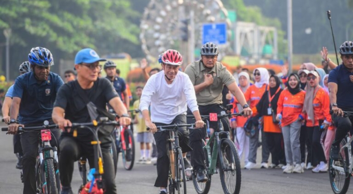 Momen olahraga di Minggu pagi juga tidak dilewatkan oleh Presiden Joko Widodo. Dengan sepeda kayu miliknya, Presiden yang keluar dari Istana Merdeka sekitar pukul 06.40 WIB langsung mengayuh sepedanya menyusuri Jalan Sudirman-Thamrin hingga ke Bundaran Hotel Indonesia (HI).