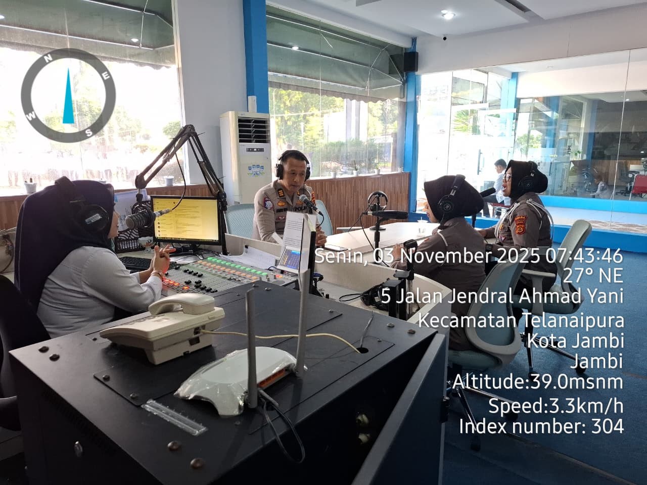 SEKATOJAMBI.COM, JAMBI – Dalam rangka meningkatkan kesadaran dan kedisiplinan masyarakat dalam berlalu lintas, Subdit Kamsel Ditlantas Polda Jambi melaksanakan kegiatan Patroli Udara Siginjai RRI Pro 2 yang bertempat di Studio RRI Pro 2 FM Jambi, Senin (3/11/2025).
