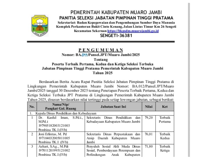 Pengumuman ini tertuang dalam Berita Acara Nomor BA.012/Pansel.JPT/Muaro Jambi/2025 tertanggal 30 Desember 2025, sekaligus menjadi penentu awal bagi pejabat yang akan mengisi posisi kunci di tubuh birokrasi Pemkab Muaro Jambi.