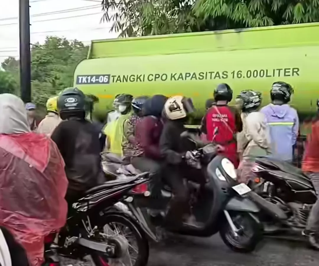 Seorang pengendara motor, Amran Sakiman (49), tewas mengenaskan usai terlindas truk tangki pengangkut Crude Palm Oil (CPO).