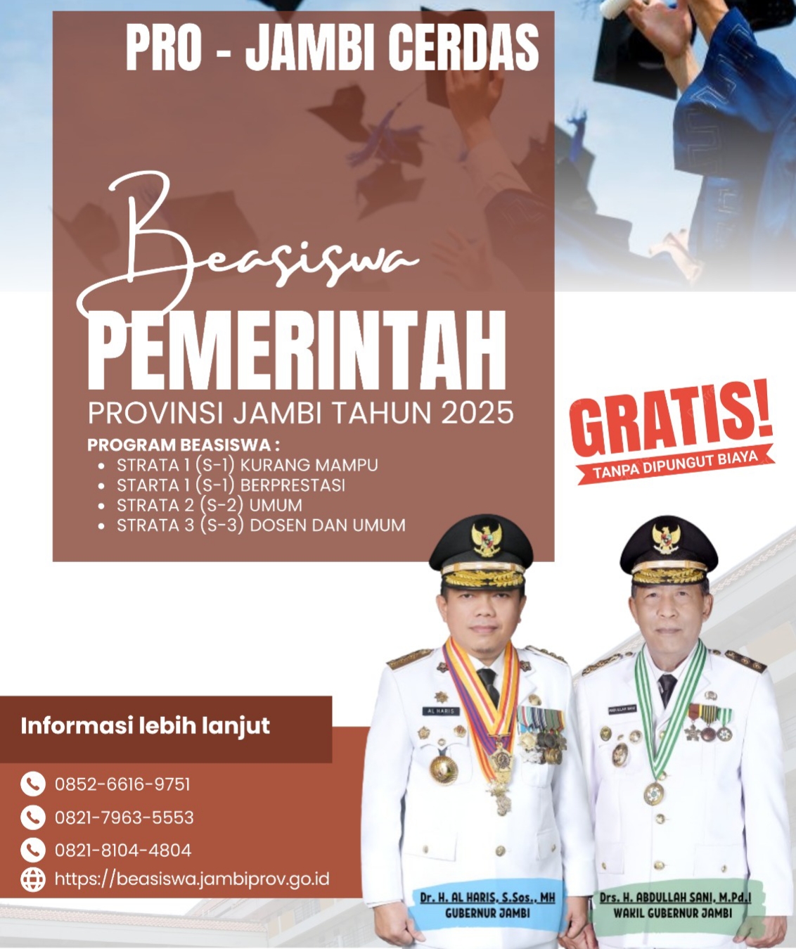 SEKATOJAMBI.COM, JAMBI – Pemerintah Provinsi Jambi dengan visi Jambi Mantap Berkelanjutan melalui Biro Kesramas Setda Provinsi Jambi kembali meluncurkan program Pro Jambi Cerdas untuk tahun 2025. Program beasiswa Pro-Jambi Cerdas menjadi pilar strategis yang mencakup bantuan biaya pendidikan bagi siswa kurang mampu juga siswa berprestasi untuk jenjang S1, S2, dan S3. PRO-JAMBI CERDAS adalah langkah berani untuk menciptakan masyarakat Jambi yang cerdas, kompetitif, dan siap menghadapi tantangan global.