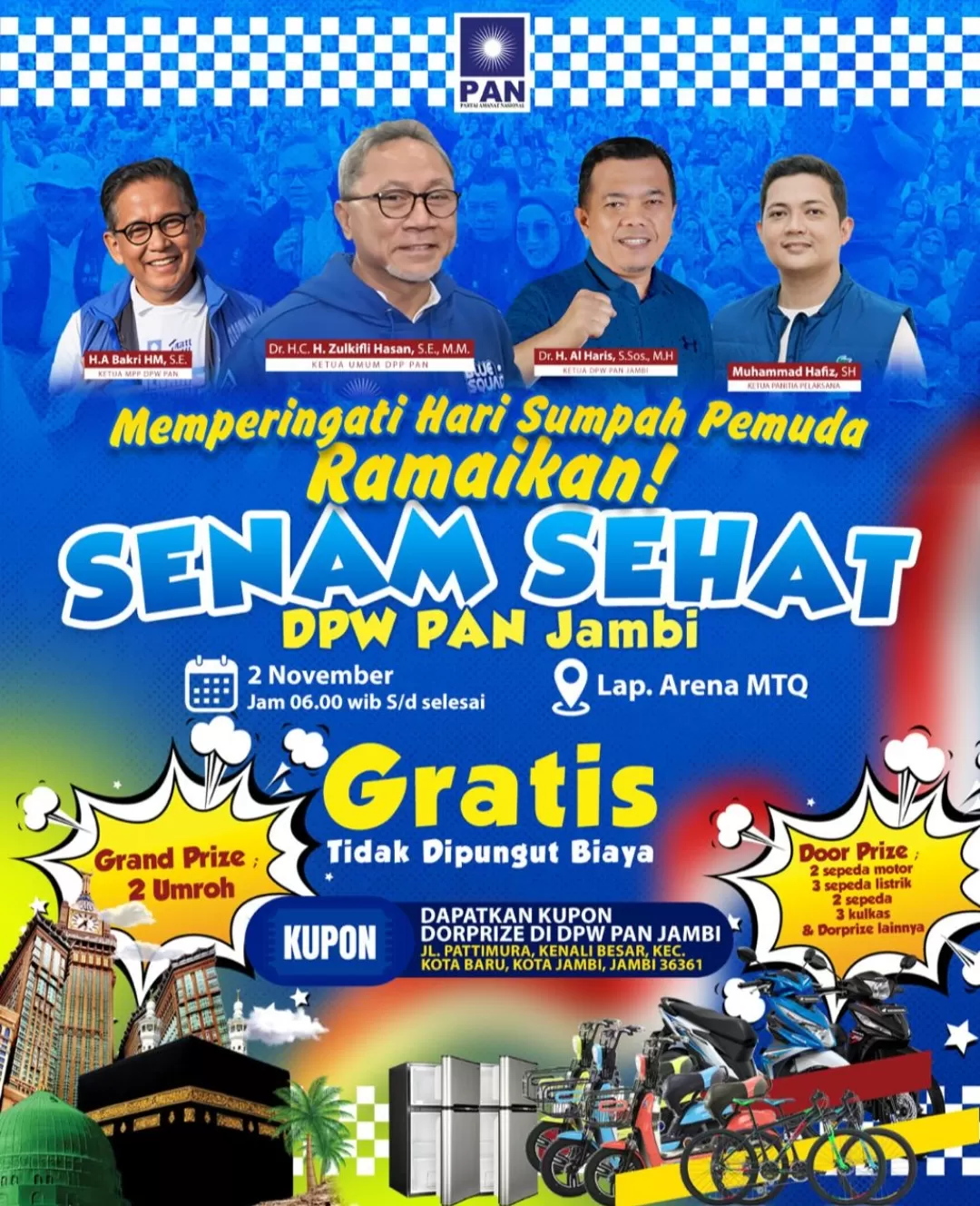 Acara Senam Sehat DPW PAN Jambi akan digelar pada Minggu, 2 November 2025, di Lapangan Arena MTQ, tepat di depan Bandara Sultan Thaha Jambi.