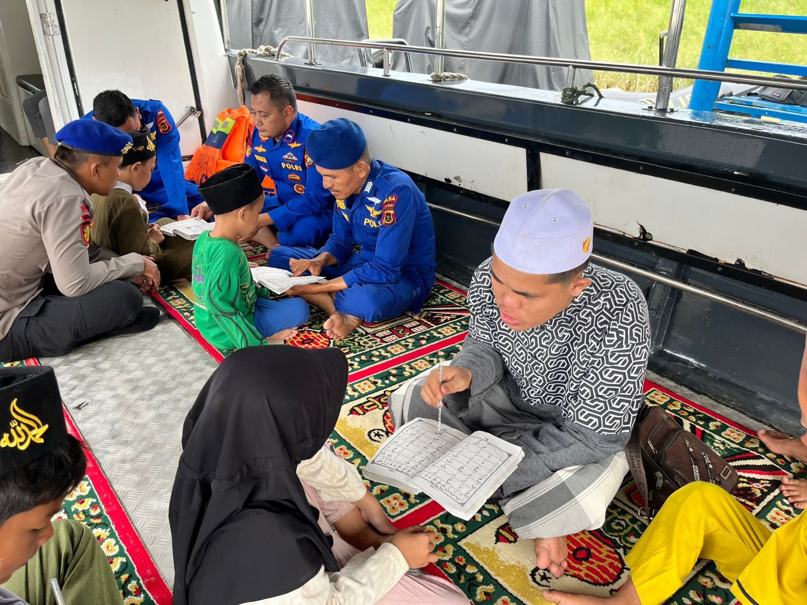 Pembelajaran mengaji dipandu oleh Ustadz Zulfahman dengan didampingi personel Ditpolairud Polda Jambi, Anak-anak tampak antusias dan bersemangat mengikuti kegiatan ini.
