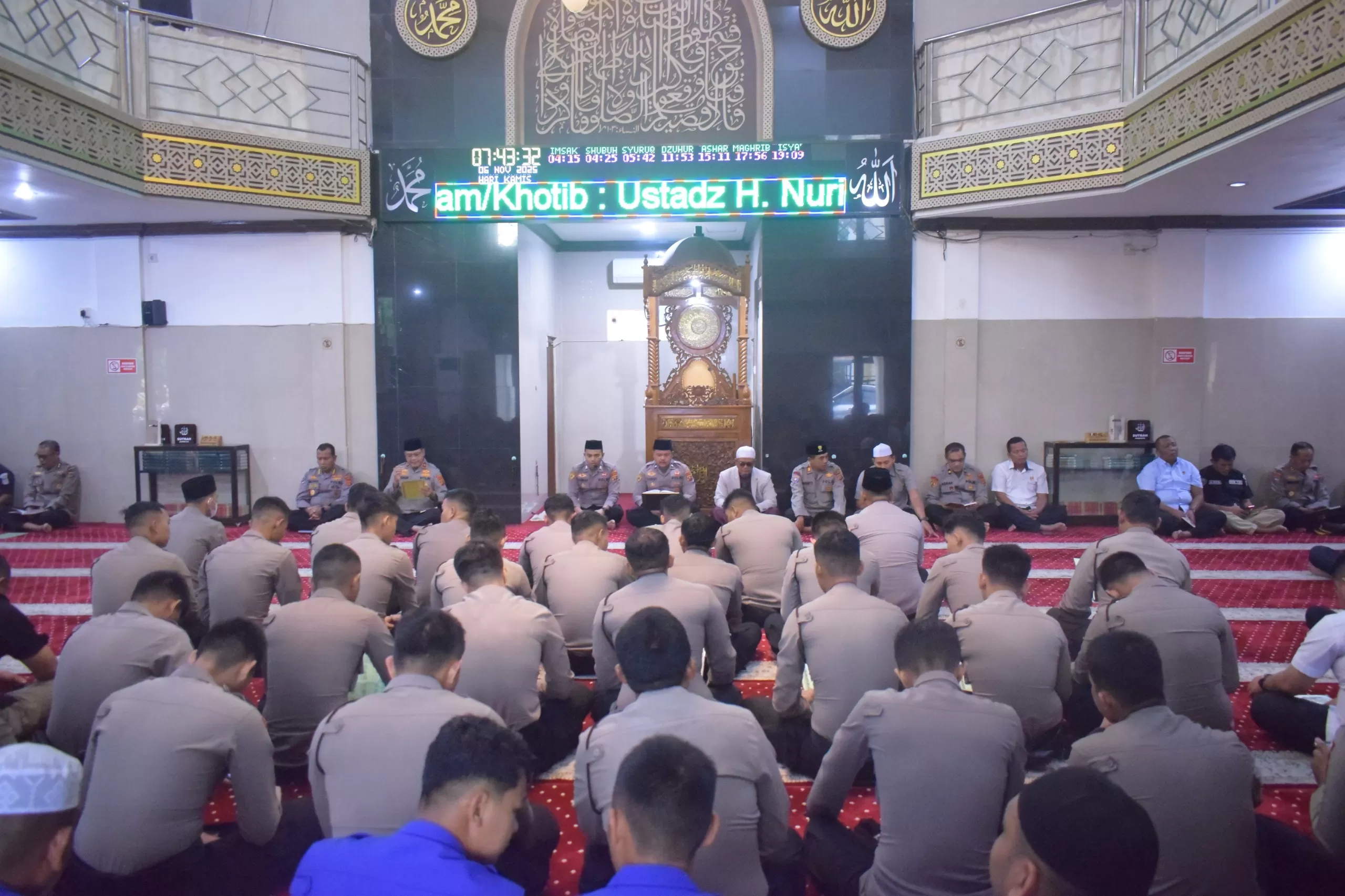 Pembinaan rohani bagi personel muslim dipusatkan di Masjid Al-Ikhlas Polda Jambi. Kegiatan tersebut dihadiri Wakapolda Jambi Brigjen Pol M. Mustaqim, para Pejabat Utama, para perwira, serta personel Polda Jambi. Rangkaian acara diawali dengan pembacaan Ummul Qur’an, Asmaul Husna, Surah Yasin, tausiyah, dan ditutup doa bersama.