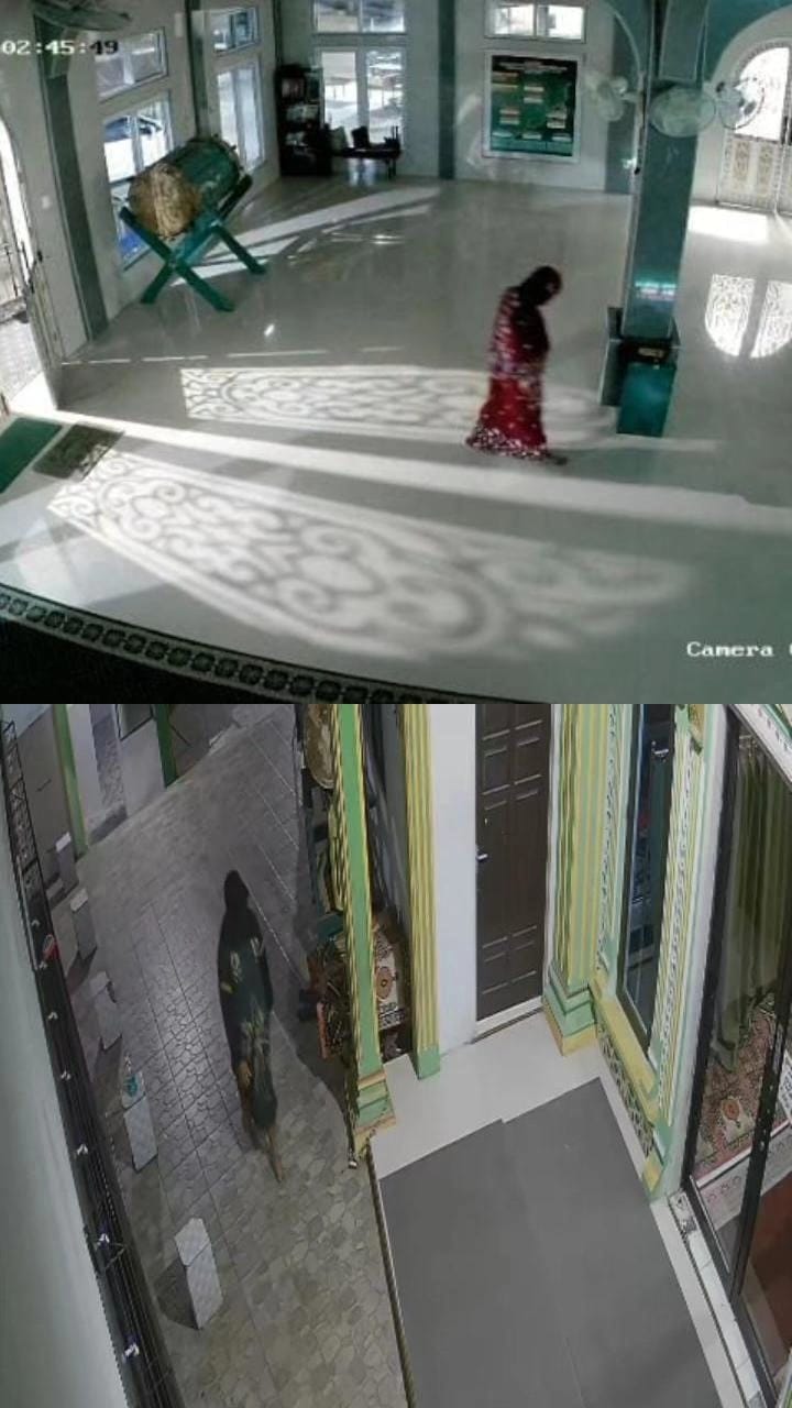 Dalam rekaman CCTV sekitar pukul 02.47 WIB ditemukan ada seorang lelaki menggunakan kerudung layaknya jamaah perempuan bergegas ke tempat berdirinya dua kotak amal masjid.