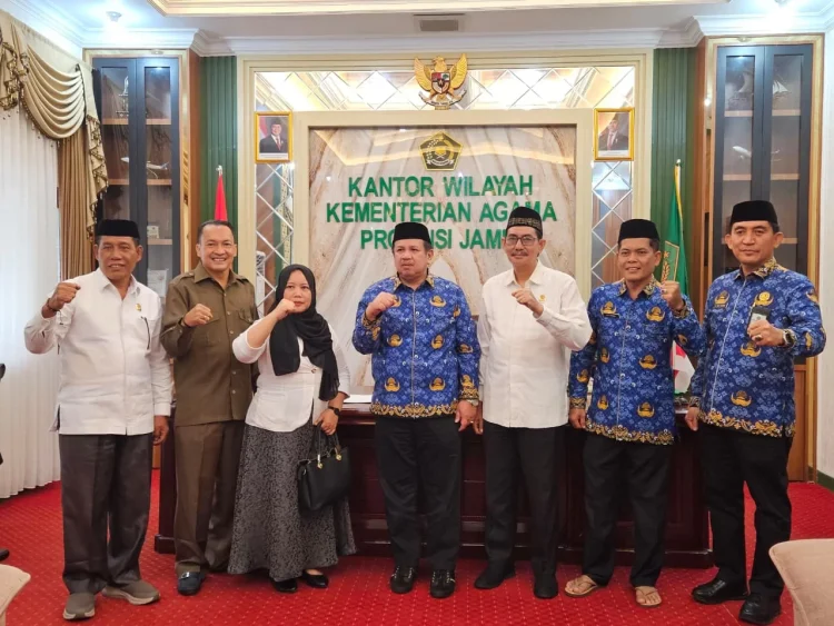 LSEKATOJAMBI.COM, JAMBI – Kepala Kantor Wilayah Kementerian Agama Provinsi Jambi, Mahbub Daryanto, didampingi Kepala Bagian Tata Usaha, Faizan, dan Kepala Bidang Penerangan Agama Islam dan Pemberdayaan Zakat dan Wakaf, Abd. Rahman, menerima kunjungan kerja dari beberapa pengurus Badan Amil Zakat Nasional (Baznas) Provinsi Jambi pada Senin (20/10/2025) di ruang kerja Kakanwil.