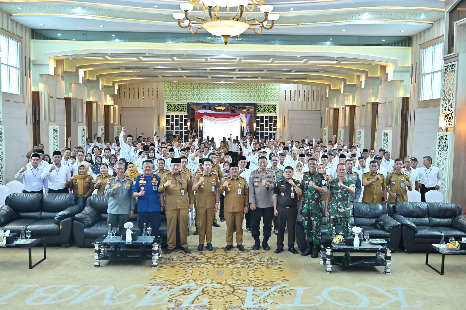 Pengukuhan ditandai dengan pembacaan sumpah/janji Anggota Satlinmas secara simbolis oleh perwakilan masing-masing Kecamatan, serta penyematan tanda Anggota yang secara langsung dilakukan oleh Wali Kota Dr. dr. H. Maulana, M.K.M., didampingi Wakil Wali Kota Diza Hazra Aljosha, S.E., M.A,.