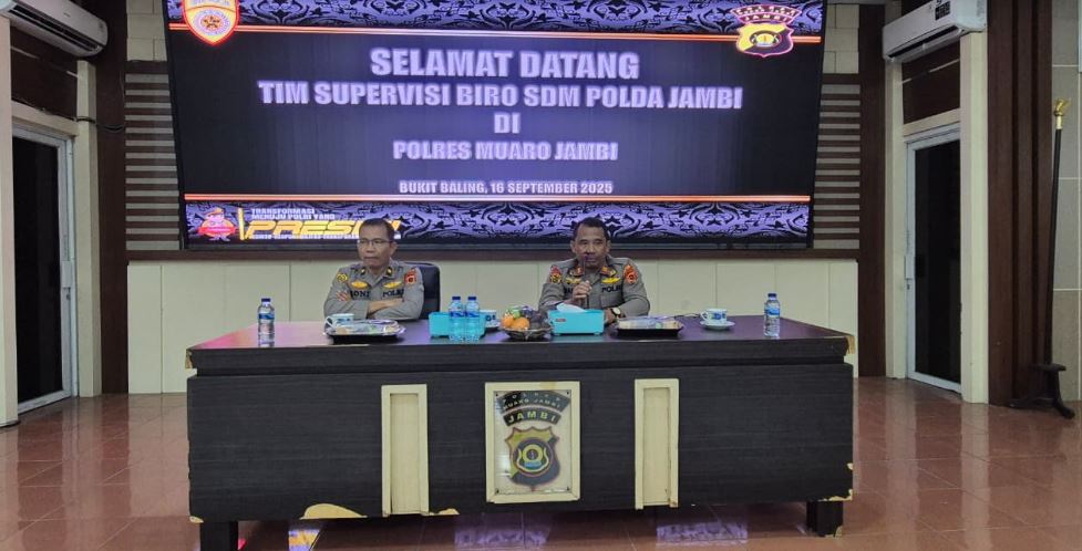 SEKATOJAMBI.COM, MUARO JAMBI – Tim Supervisi Biro SDM Polda Jambi melaksanakan kegiatan Supervisi (pemantauan dan evaluasi) Program Bidang SDM T.A 2025 di Polres Muaro Jambi, Selasa (16/09/2025) pagi. Kegiatan yang berlangsung di Aula Wira Pratama Polres Muaro Jambi ini berjalan lancar dengan situasi aman dan kondusif.