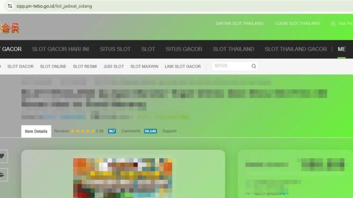 Laman PN Tebo yang beralamat https://sipp.pn-tebo.go.id/ seharusnya menampilkan informasi jadwal sidang perkara yang sedang disidangkan di PN Tebo. Namun saat ini, laman website tersebut menampilkan judi online (judol) slot Thailand.